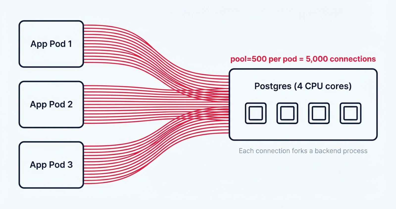 That is the kind of config that looks sensible until you do the math. Hibernate's Hikari pool default is 10. We had bumped it to 500 because someone had read a Stack Overflow answer about "scaling Postgres" and wanted headroom. Multiply that across ten app pods and you are not running a database anymore, you are running a fork bomb. Postgres forks a process per connection, each one eating around 10 MB of RAM, and they all fight for the same four CPU cores. Throughput collapsed long before we hit any real query bottleneck.