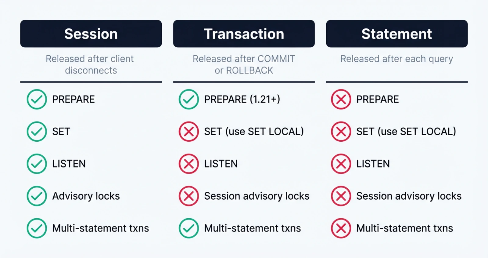 Statement mode is too restrictive for anything that uses multi-statement transactions, which means it is too restrictive for anything that uses an ORM. Session mode gives you full Postgres compatibility but throws away the multiplexing benefit, so you might as well not use a pooler. Transaction mode is where the magic happens, and it is also where you have to know what you are doing, which is the next section.