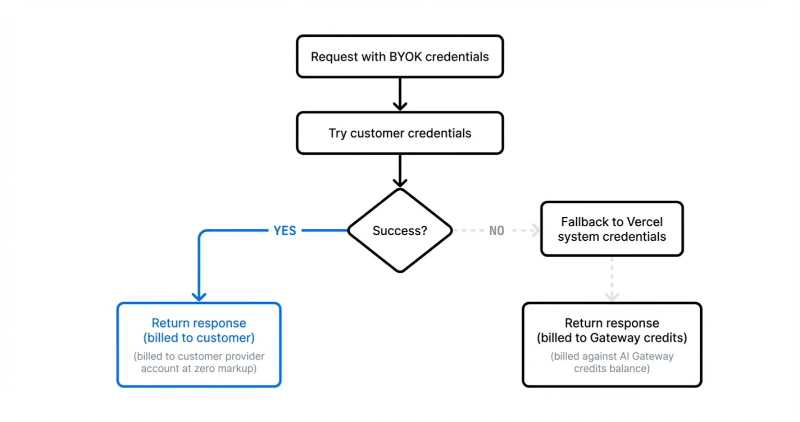 The obvious catch: you still need a positive AI Gateway credits balance because if your BYOK credentials fail, the Gateway falls back to its system credentials and charges against your Vercel balance. That fallback is a feature, not a trap.